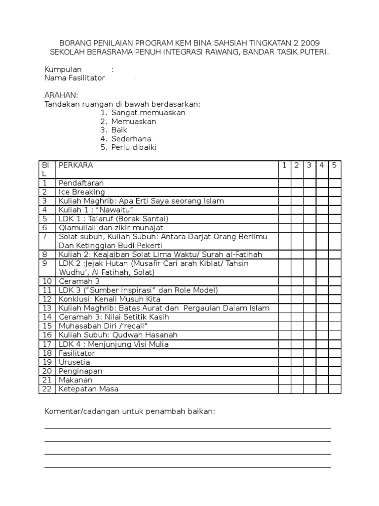 Contoh Borang Penilaian Program Sekolah 2018